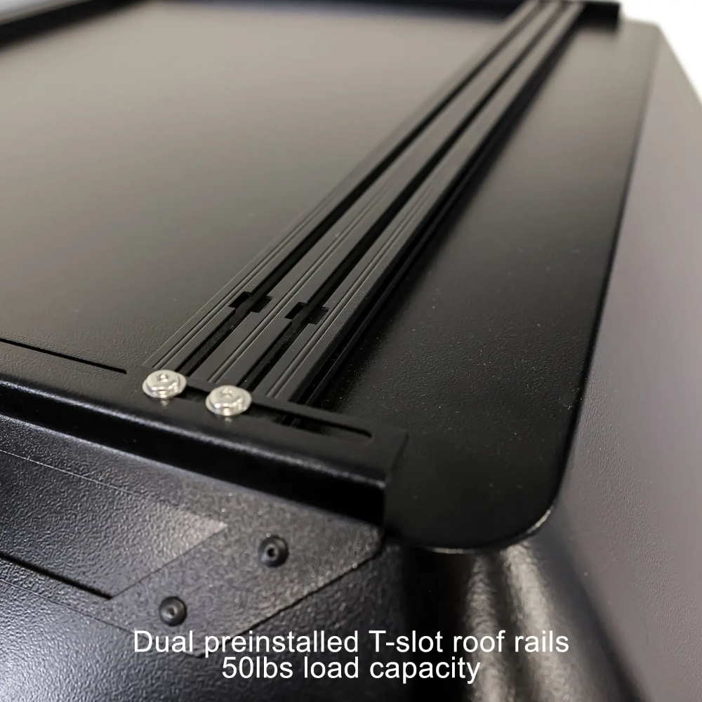 - Dual T-slot roof rails (41” x 2.75”) with 50 lb capacity for roof-mounted gear