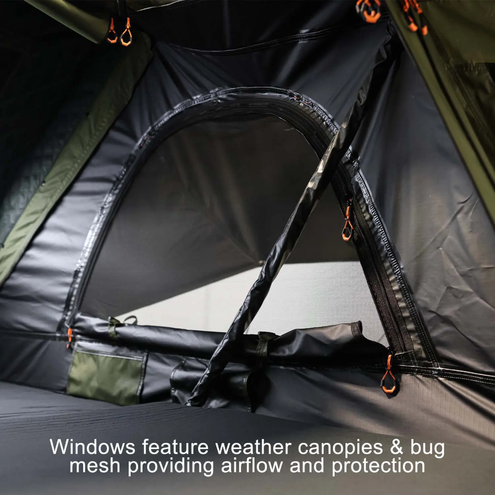 - Oversized windows with mesh and weather canopies for 360° airflow