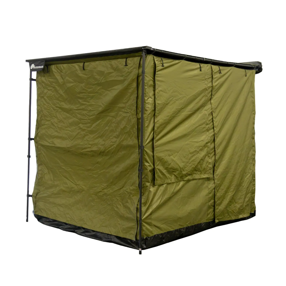 Designed to integrate seamlessly with the Bushman Awning, this room offers fast setup with hook and loop straps and secure pole clips. Its adjustable height accommodates different vehicle setups, while multiple access points—including a rear door for vehicle entry—ensure functionality. When not in use, it packs down compactly into the included storage bag for convenient transport.